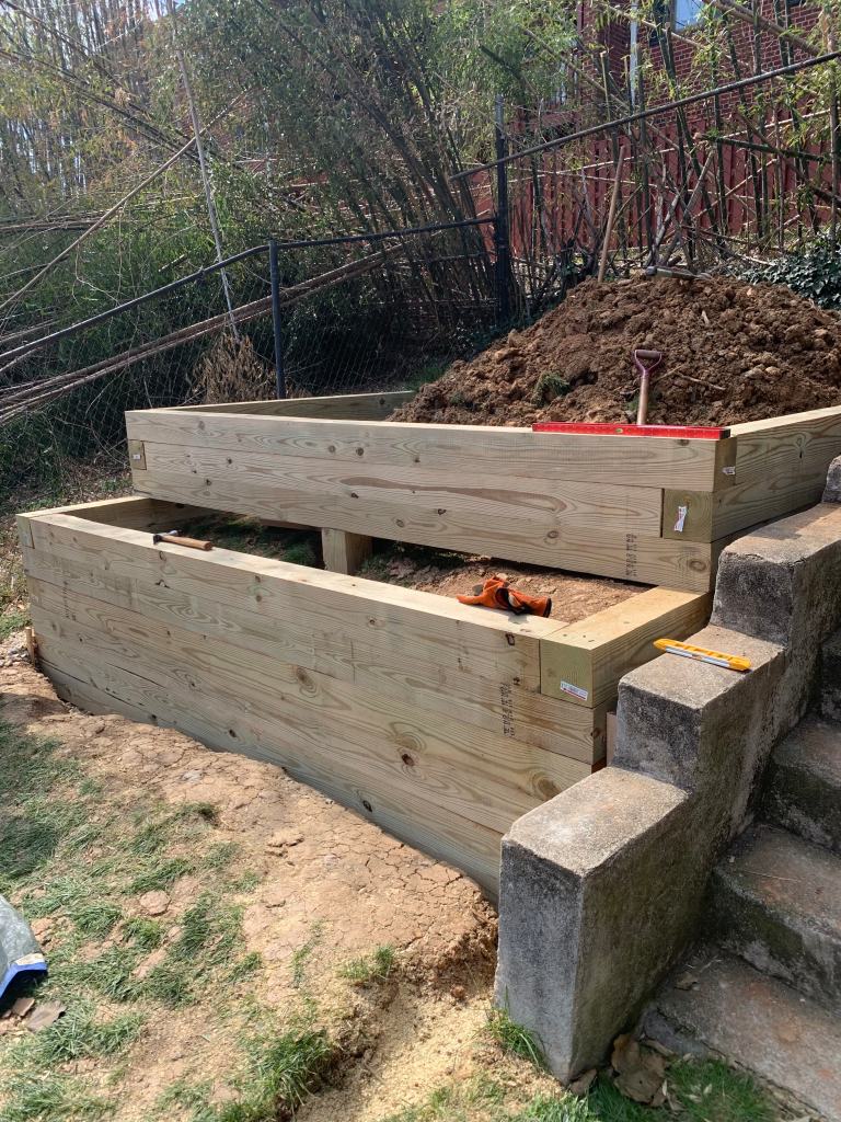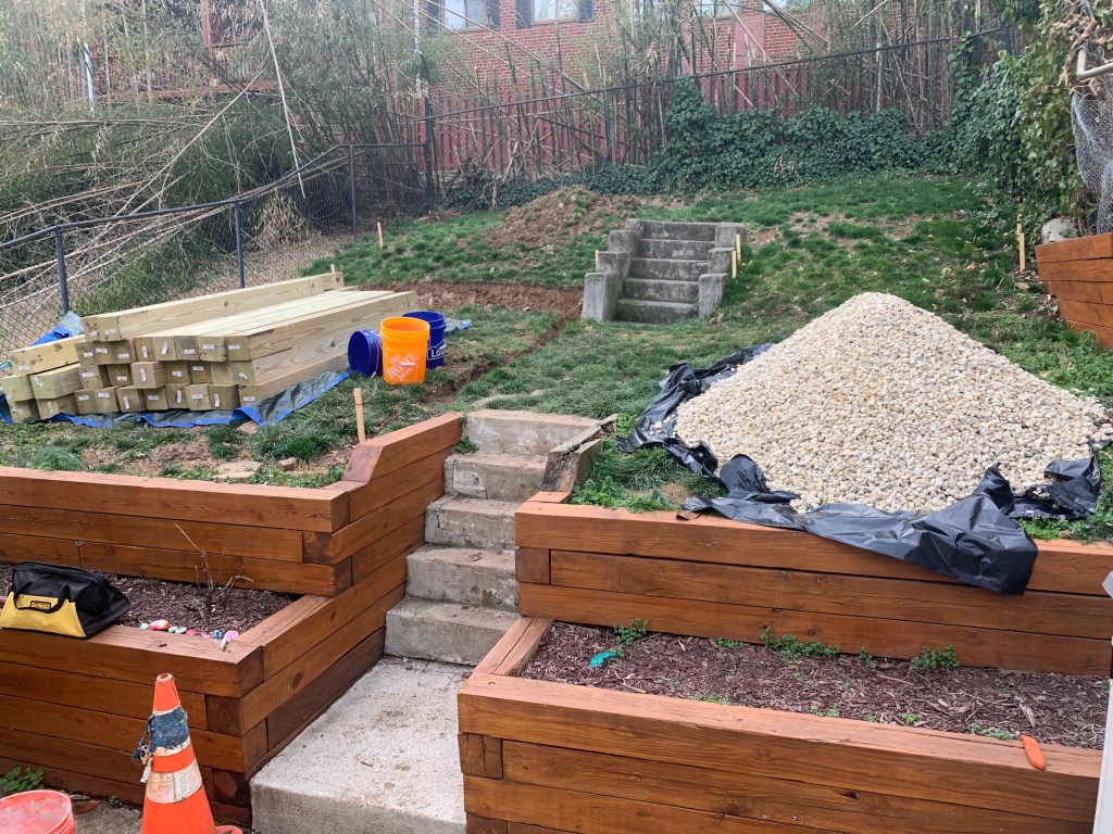 We overcame the base layer challenges and built upon a foundation that I’m sure will last a lifetime (…in dog years, if I’m lucky). By the end of the weekend, an identical retaining wall now mirrored the first wall across the Stairs to Nowhere. The yard had been – dare I say it – retained. A cohesive mass of timber now made it possible to create functional spaces for play, relaxation, and doody.