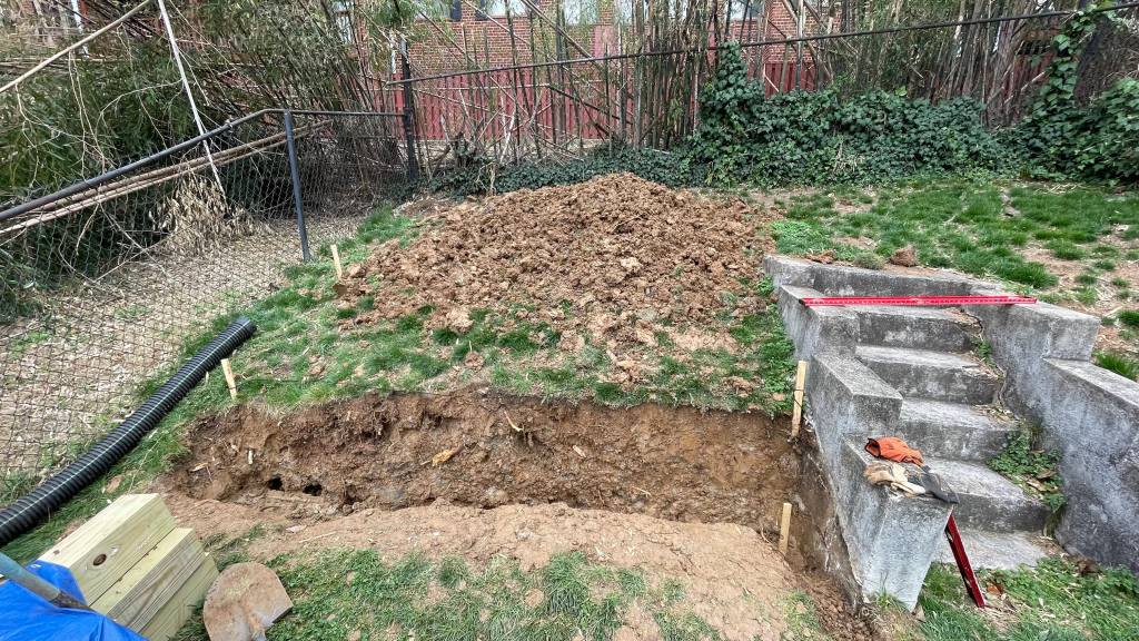 A couple months elapsed before taking a stab at the second wall on the other side of the Stairs to Nowhere. Doing the same thing over again didn’t seem too intimidating since the first wall went mostly smooth. And so, excavation began… only to uncover an unexpected surprise: The base of a cinder block wall was chillin exactly where I planned to build the new timber wall!