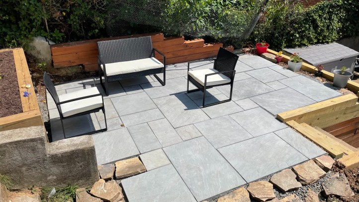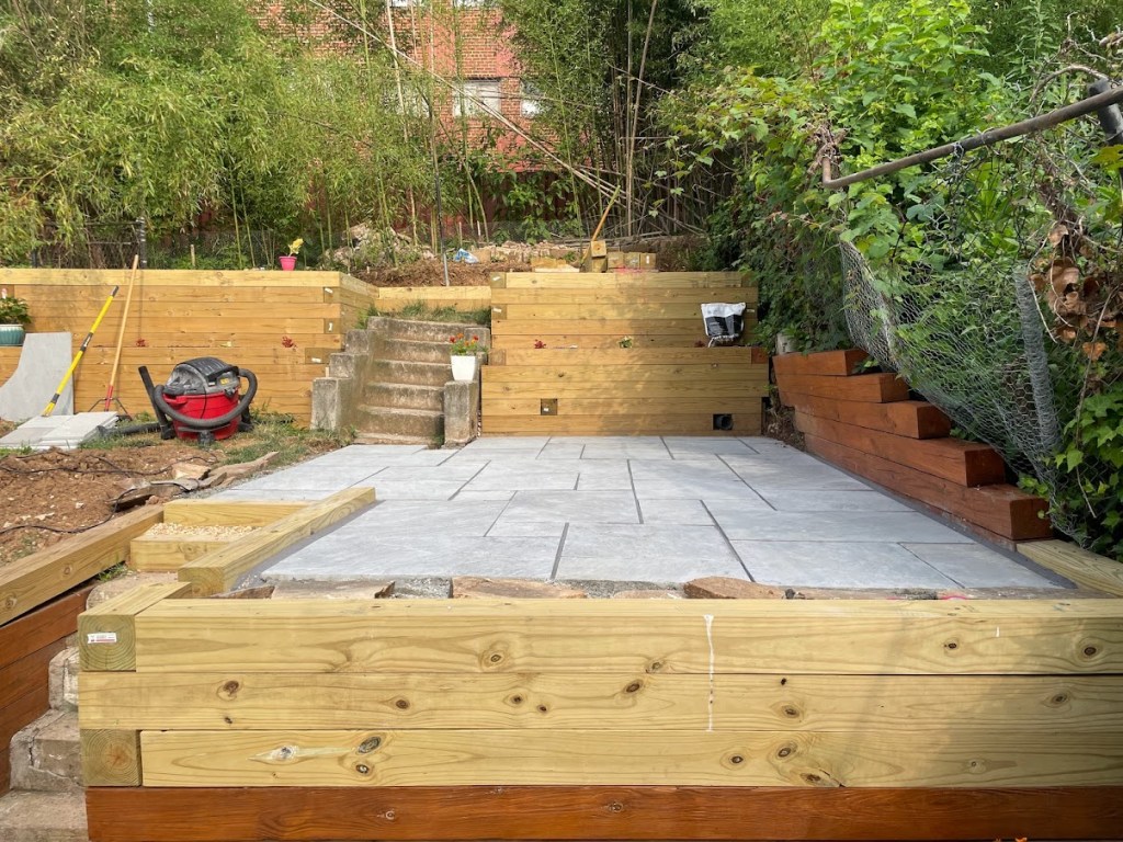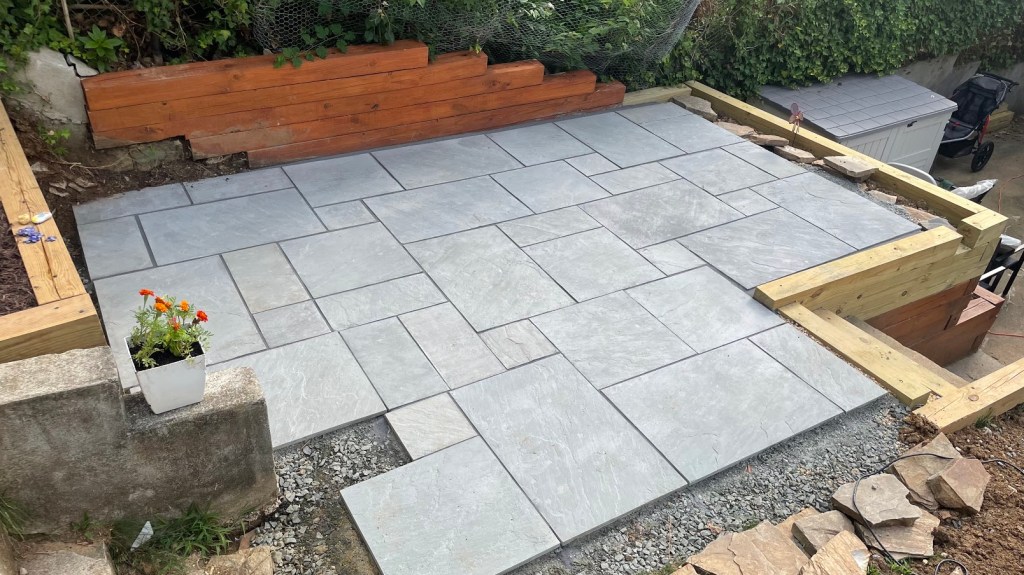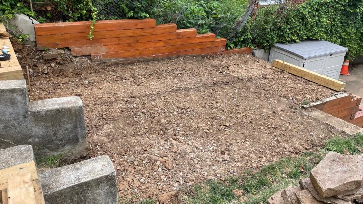 Up till this point, the yard was too sloped to accommodate any type of social space. With the new timber retaining walls complete, I had around 150 SF of newly-created usable space that was the perfect size for a patio. I combed the internet to learn how to lay a stone patio, ordered a “Patio Pack” of Silver Gray sandstone pavers, 5.5 tons of stone aggregate, and 1.5 tons of stone dust from a supplier and got to work!
