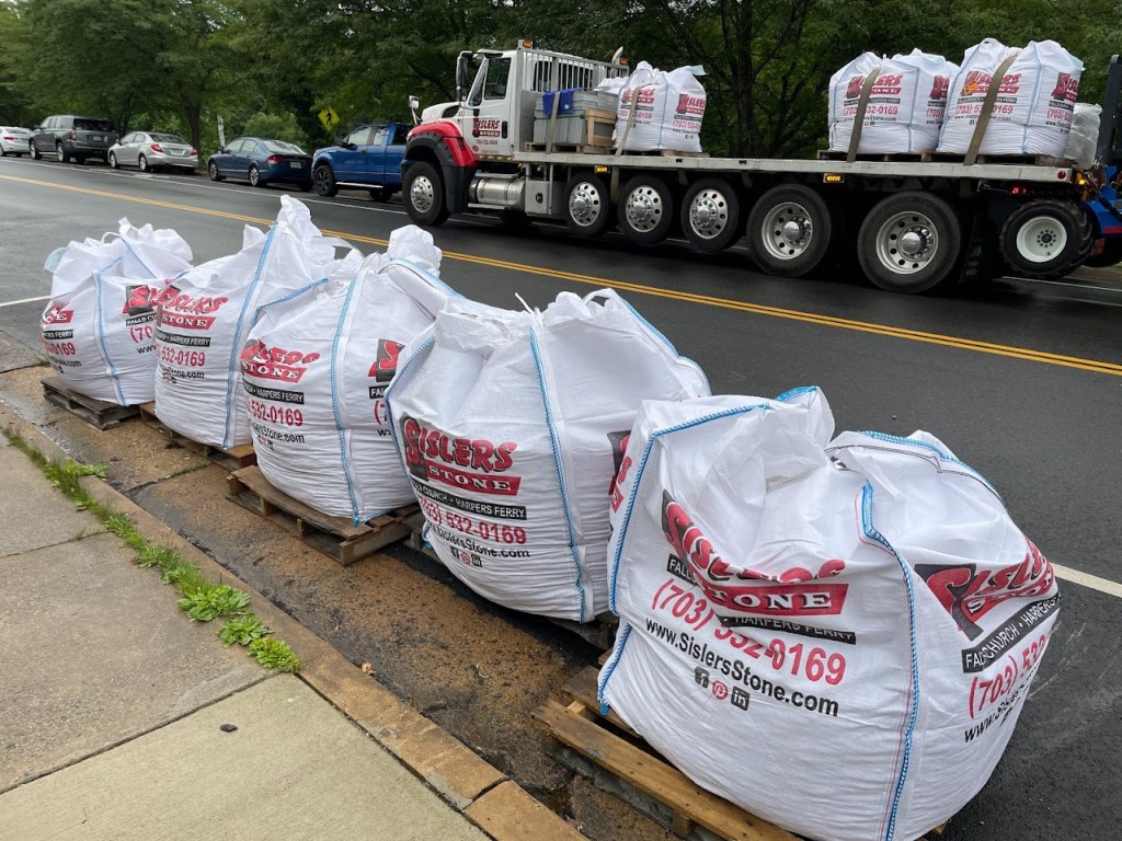 The most intimidating part of the patio job was the sheer amount of stone aggregate needed to form the patio base. Heavy machinery can’t access our backyard; there the staircase is too steep for a wheelbarrow. Everything transported to the backyard needs to be hauled by hand – including the 5.5 tons of stone aggregate. Knowing this, I put in for some vacation days at work, oversaw the delivery from the supplier, rented a plate compactor from Home Depot, and got to work with two 5-gallon buckets, a shovel, and ibuprofen. After 13 hours of individually hauling 11,000 pounds of stone (quite literally from sun-up to sun-down), I had a solid base layer for the stone pavers.